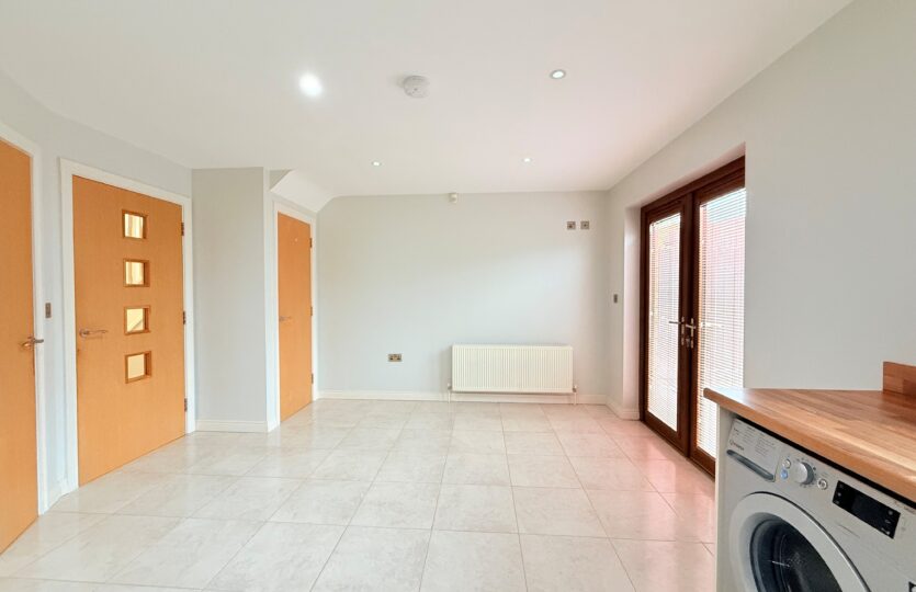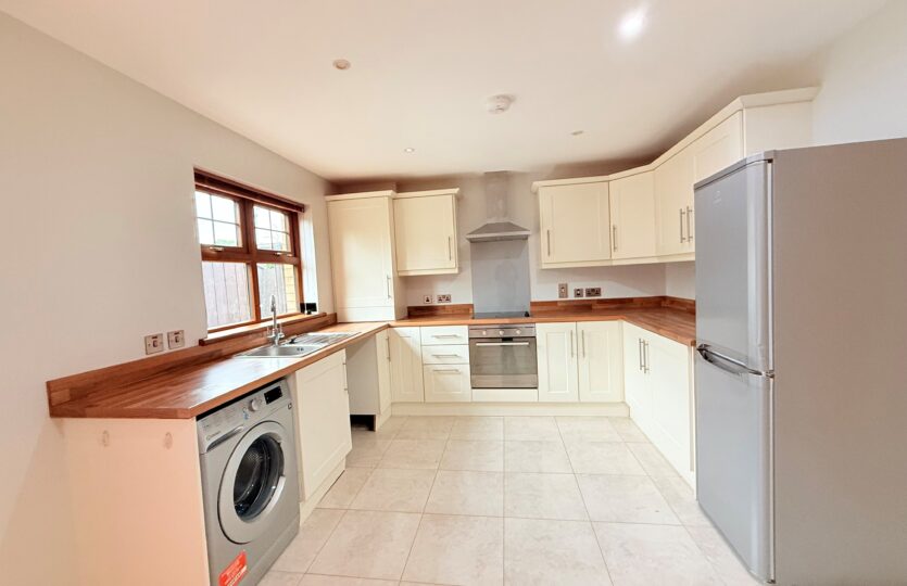 Modern shaker eye and low level units, under unit lighting, electric oven, hob and stainless steel extractor hood,, wood block effect work surface with matching upstand, plumbed for washing machine, space for tumble dryer, space for fridge freezer, stainless steel sink with mixer tap, recessed LED ceiling lighting, uPVC double glazed window and French doors to rear, built in under stairs, storage cupboard