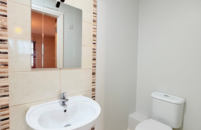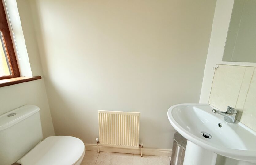 uPVC double glazed window to front, low flush wc, pedestal wash hand basin, tiled splashback, tiled flooring, radiator