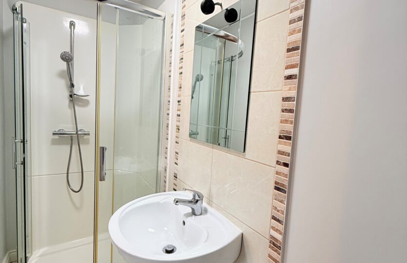 Low flush wc, pedestal wash hand basin, quadrant shower cubicle with thermostatic shower, tiled flooring, part tiled walls, radiator