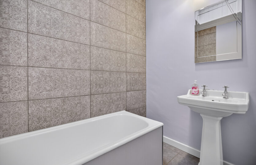 Bath with telephone mixer shower tap, low flush wc, pedestal wash hand basin, radiator, tiled flooring, part tiled walls, velux window
