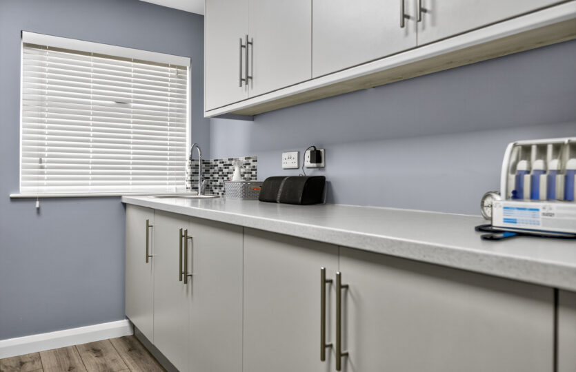 uPVC double glazed window to side, laminated flooring, fitted eye and low level units, circular sink with mixer tap