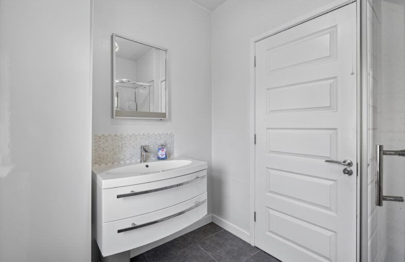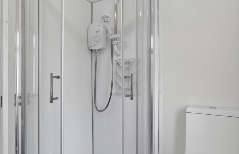 Quadrant shower cubicle with electric shower, low flush wc, wall mounted wash hand basin with mixer tap set on vanity unit with Bluetooth speaker mirror above, radiator, tiled flooring, uPVC double glazed window to rear