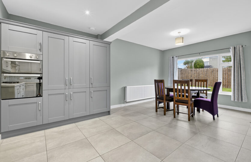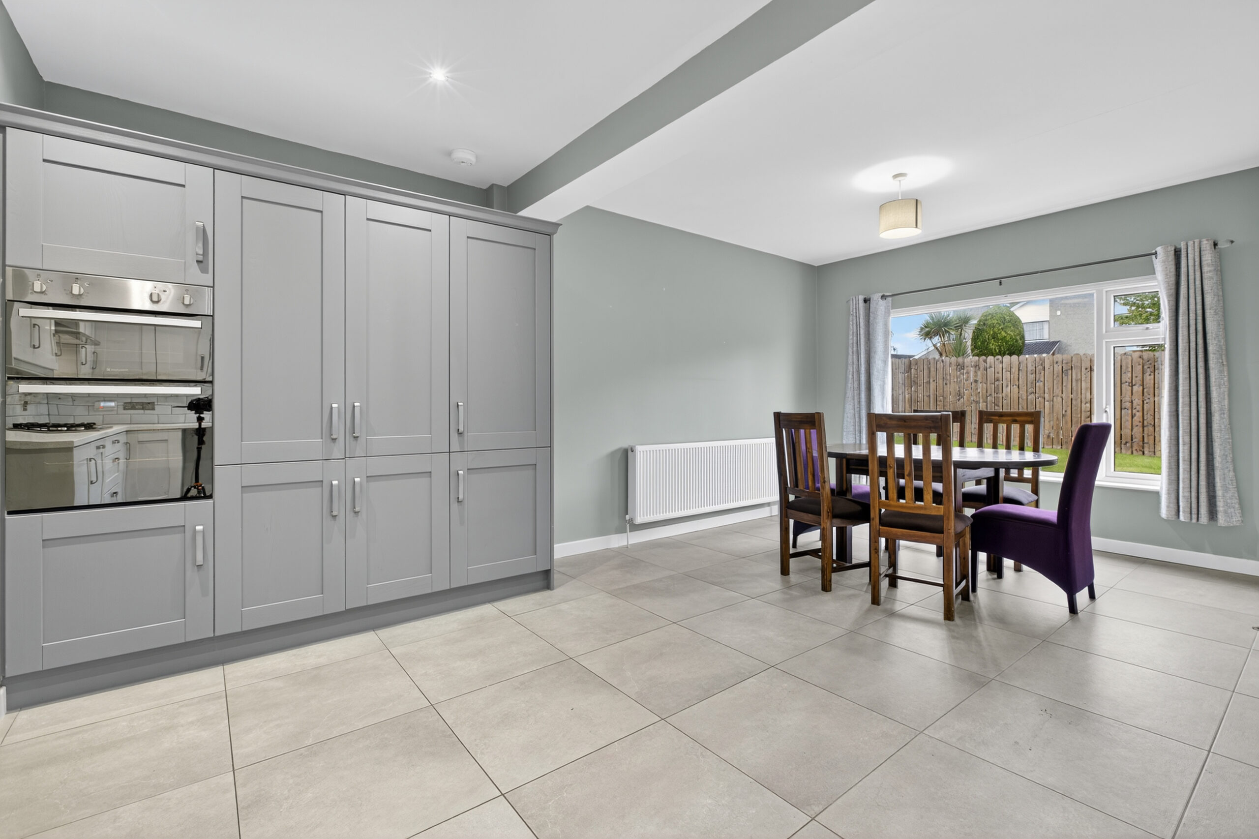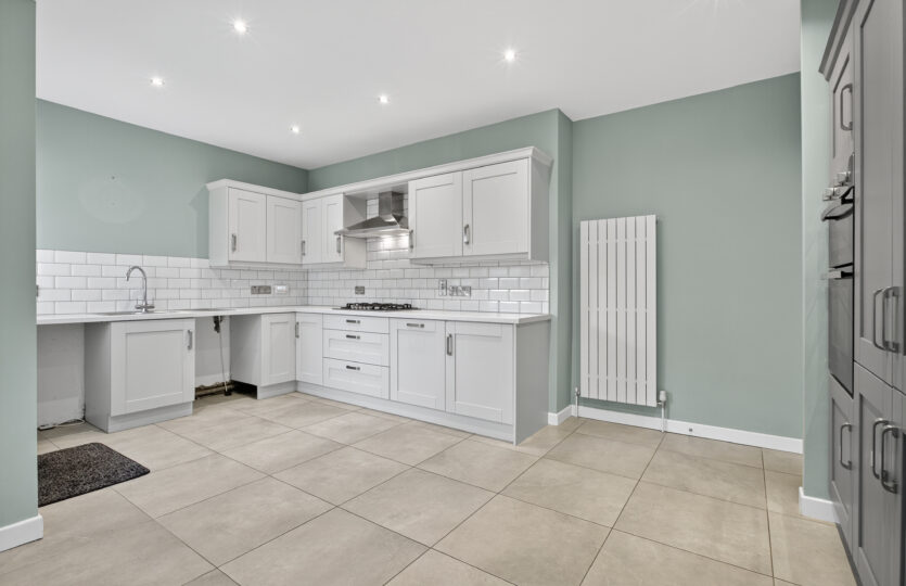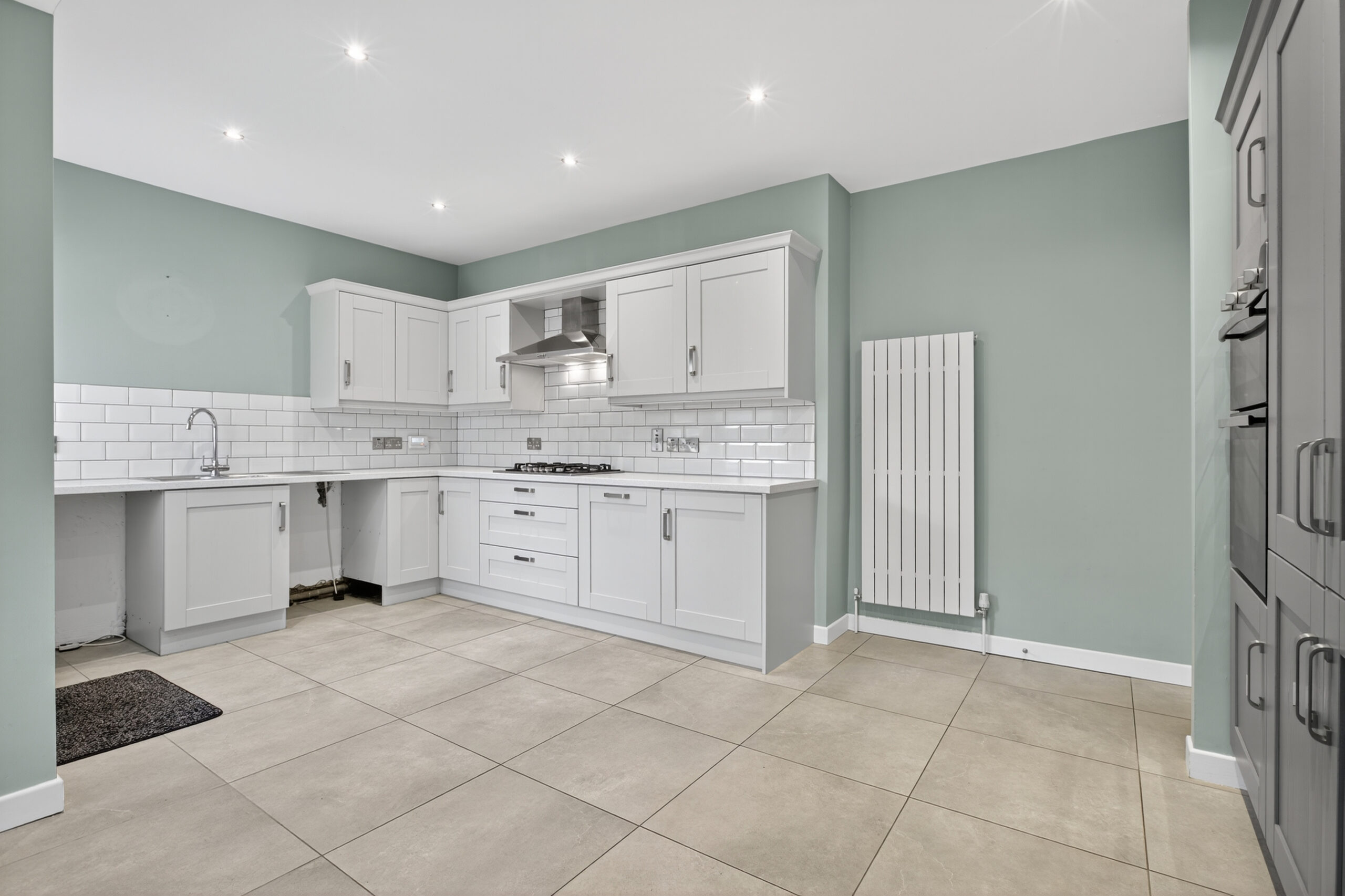 Range of shaker eye and low level units with integrated dishwasher, fridge freezer, high level double oven and grill, 5 ring gas hob, plumbed for washing machine, space for tumble dryer, 1 1/4 sink with mixer tap, uPVC double glazed window and door to rear, tiled flooring, part tiled walls, recessed LED ceiling lights, TV point