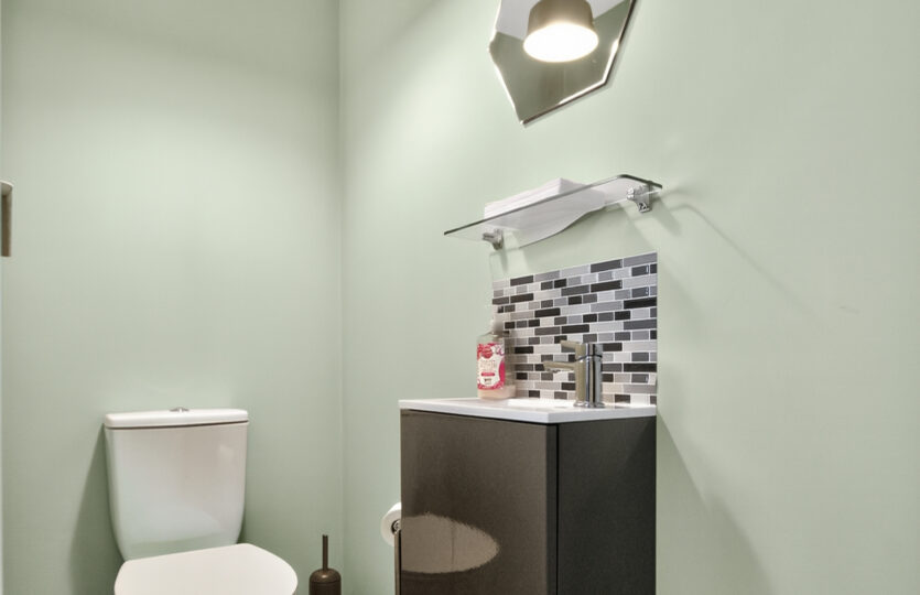Low flush wc, wash hand basin set on vanity unit with mixer tap, laminated flooring, uPVC double glazed window to side