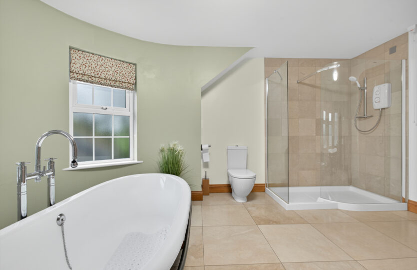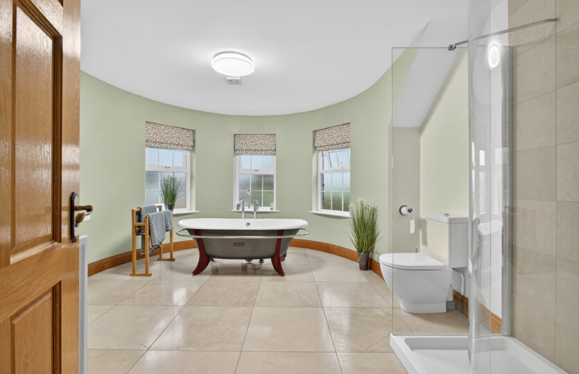 Luxury bathroom suite with feature curved wall to rear, uPVC double glazed windows, Roca cast iron freestanding bath with external chrome mixer tap, walk in tiled shower cubicle with Mira Sport electric shower, pedestal wash hand basin, tiled splashback, low flush wc, radiator, tiled flooring, electric shaver socket, built in hot press