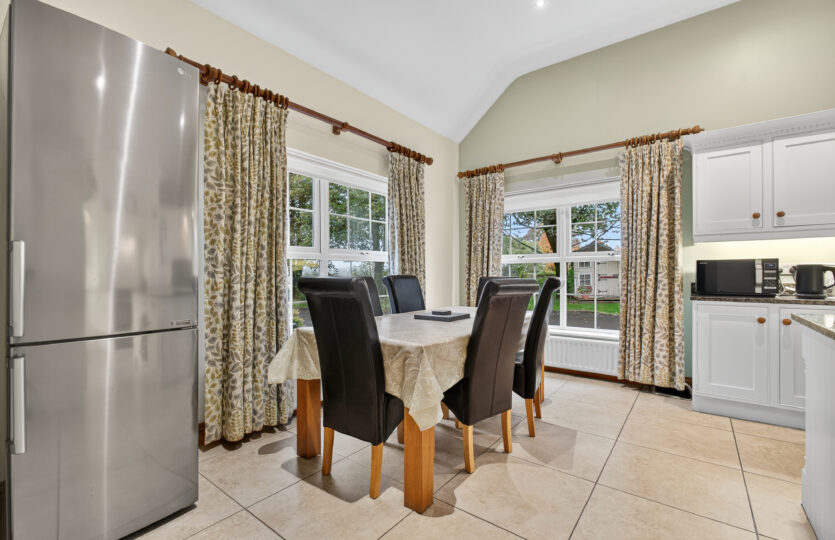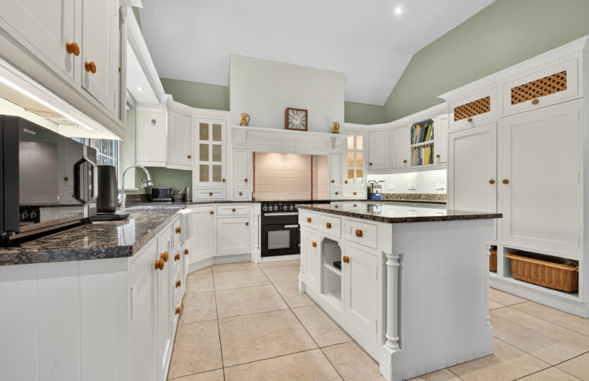 Vaulted ceiling with recessed LED lighting, panted solid wood kitchen with centre island, granite work surfaces and upstand, integrated dishwasher, space for range cooker with extractor fan above, Belfast sink with mixer tap, under unit and display cabinet lighting, tile flooring, uPVC double glazed windows to front and side
