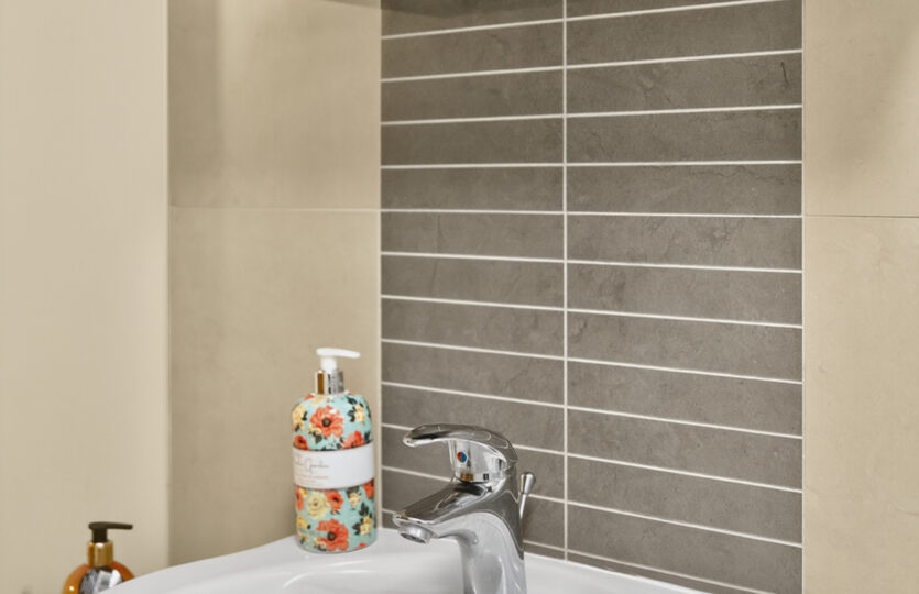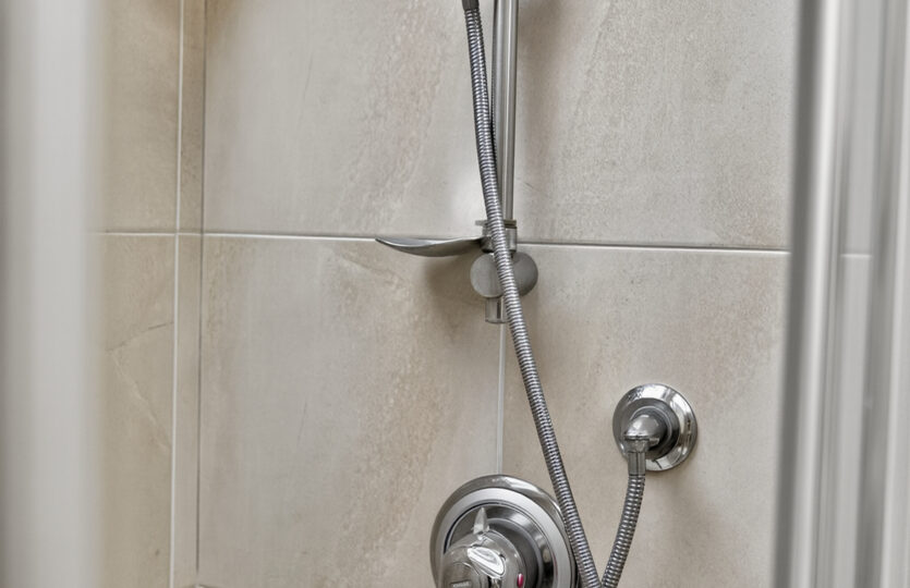 Step in double shower cubicle with thermostatic shower, low flush wc, pedestal wash hand basin, tiled flooring, part tiled walls, electric shaver point, velux window to rear