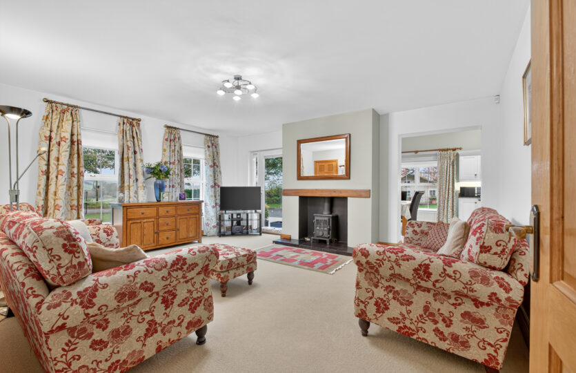 uPVC double glazed windows to front, uPVC double glazed door to side, radiator, fireplace with recessed oak mantel, multi fuel stove set on a tiled hearth, TV and telephone points, open to kitchen/diner