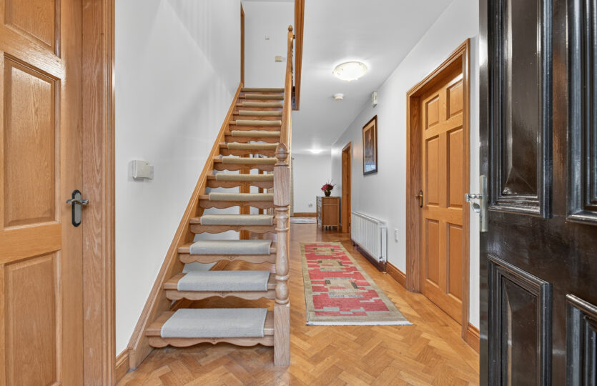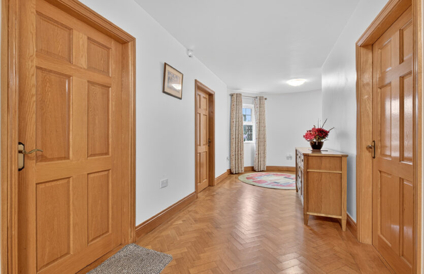 Open oak staircase with attractive Herringbone oak flooring in the hallway complimented by oak doors, skirting and architrave