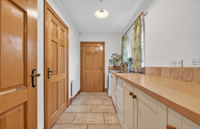 Range of shaker low level units with wood block effect work surface, stainless steel sink with mixer tap, tiled splashback, plumbed for washing machine, space for tumble dryer, uPVC double glazed window to rear, radiator, tiled flooring, door to cloaks cupboard and door to ground floor wc