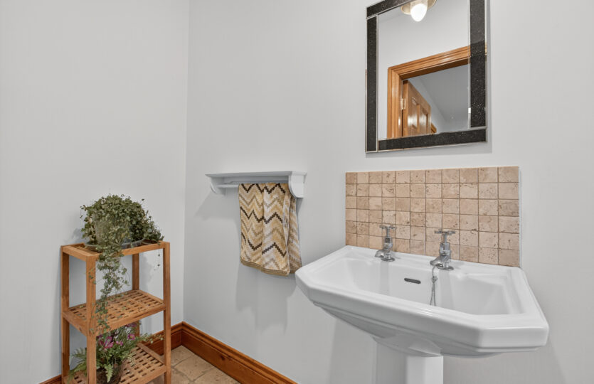 Low flush wc, pedestal wash hand basin, tiled splashback, tiled flooring, radiator, uPVC double glazed window to rear