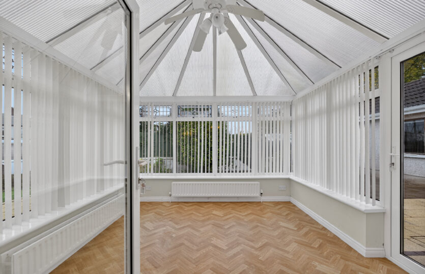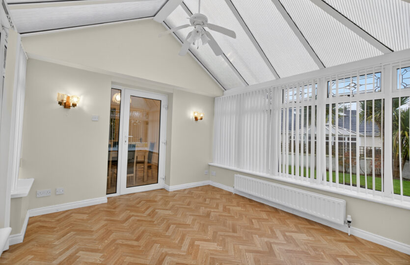 Laminated wooden flooring, radiator, coved ceiling, built in cupboard, uPVC double glazed door to conservatory