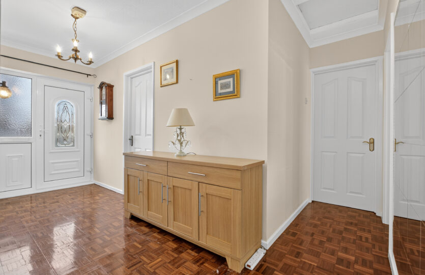 uPVC double glazed door to front with double glazed side window, coved ceiling, wooden parquet flooring, radiator, wall light, built in hot press and storage cupboard