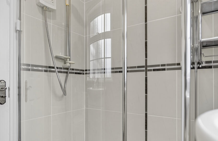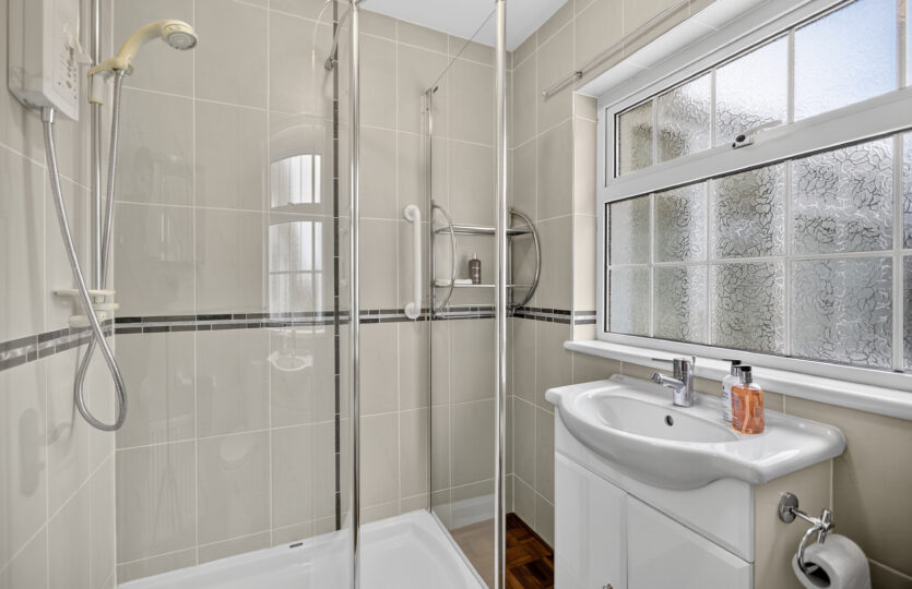 Step in shower cubicle with Mira electric shower, wash hand basin with mixer tap set on vanity unit, low flush wc, radiator, fully tiled walls, wooden parquet flooring, uPVC double glazed window to rear